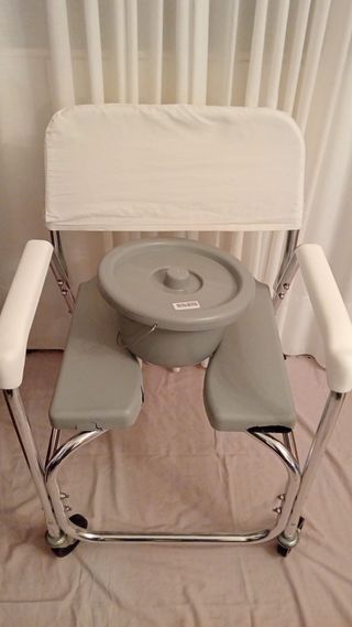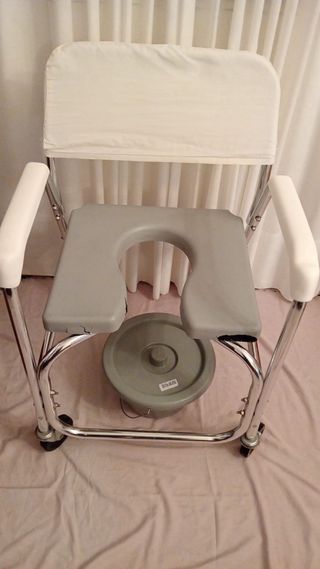 Silla de baño con orinal incorporado, ideal para mayor comodidad y seguridad. - Estructura metálica. - Asiento y reposabrazos de plástico. - Incluye orinal con tapa.