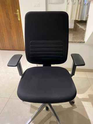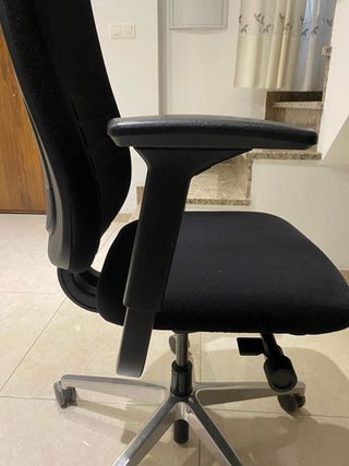 Se vende silla de escritorio. Es una silla giratoria de color negro, con ruedas y brazos. Está en buen estado, aunque presenta algo de desgaste en los reposabrazos y asiento. - Cómoda y práctica para trabajar. - Estructura resistente. - Ideal para oficina u hogar.