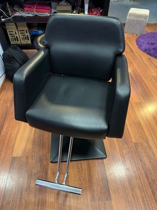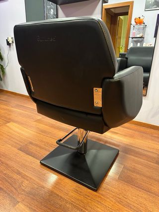 Sillón de peluquería con un diseño moderno y elegante. - Base cuadrada y robusta. - Reposabrazos acolchados. - Altura ajustable. Tiene alguna manchita en el respaldo que apenas se aprecian