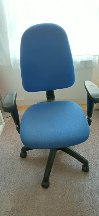 Silla de escritorio cómoda y funcional, con un diseño moderno. - Tapicería en tela azul. - Reposabrazos ergonómicos. - Base de plástico resistente.