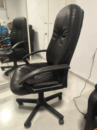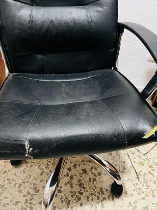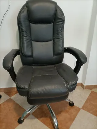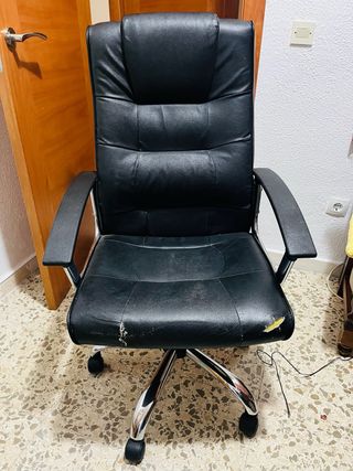 Silla de oficina en buen estado de funcionamiento. Cómoda y acolchada, con respaldo alto y reposabrazos, ideal para trabajar frente al ordenador o para oficina en casa. Estado: • Mecanismo, elevación y ruedas funcionan correctamente • Tapizado de polipiel en general bien conservado Defectos (visibles en las fotos): • Desgaste y pequeños daños en la polipiel en un lateral del respaldo • Marcas de uso y pintura desgastada en la parte superior de los reposabrazos Los defectos son estéticos y no afectan al uso ni a la comodidad. Buena opción si buscas una silla cómoda a buen precio. Posible recogida en mano.