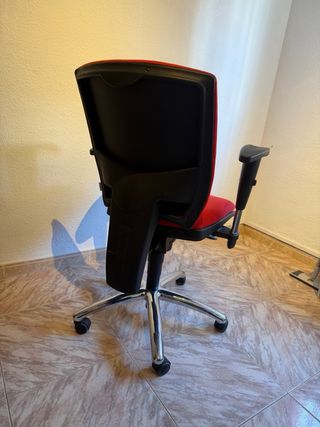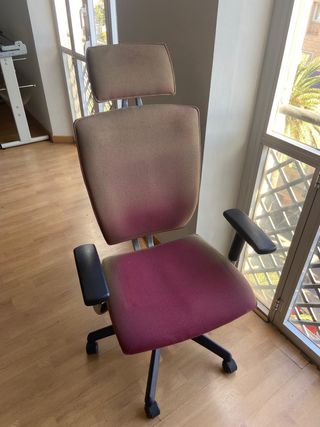 38€ cada una 5 sillas de oficina con diseño ergonómico, reposacabezas y reposabrazos. Las sillas se encuentran en buenas condiciones, la tapicería se ha descolorido debido al paso del tiempo y la acción del sol y algunos reposabrazos tienen imperfecciones. - Tapicería de tela tono burdeos (color desgastado) - Estructura metálica reforzada con plástico rígido - Base con 5 ruedas - Altura variable, balancín y riñonera con altura variable - Los reposabrazos pueden quitarse MEDIDAS: · Ancho del asiento: 52cm · Ancho con brazos: 67 cm · Fondo: 65cm · Altura variable (122-132cm)