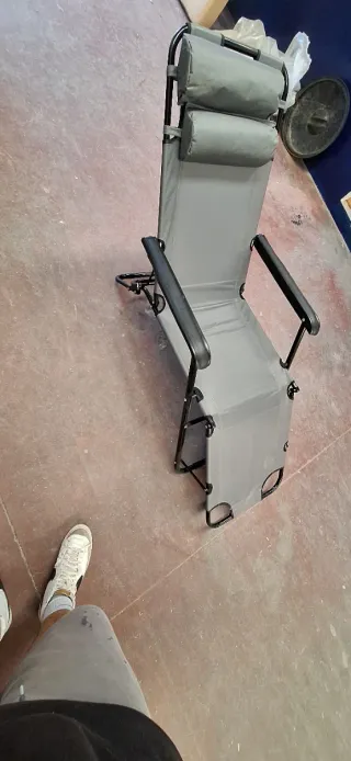Silla eléctrica plegable en buenas condiciones. - Estructura de metal resistente. - Asiento y respaldo de tela. - Reposabrazos y reposapiés de plástico.