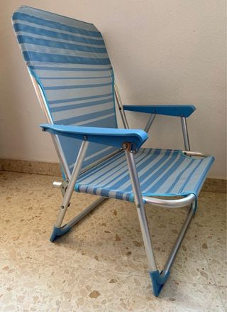 Silla de playa plegable con un diseño de rayas azules y blancas. Es ligera y fácil de transportar. - Estructura de metal. - Asiento y respaldo de tela. - Reposabrazos de plástico.
