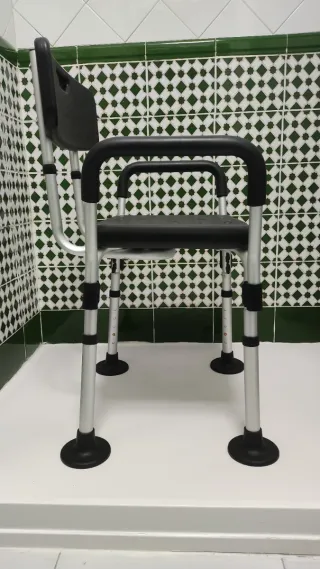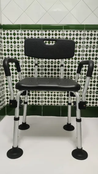 Silla de ducha con asiento y respaldo. - Patas ajustables en altura. - Reposabrazos para mayor seguridad. - Diseño con orificios en el asiento para drenaje. Precio negociable