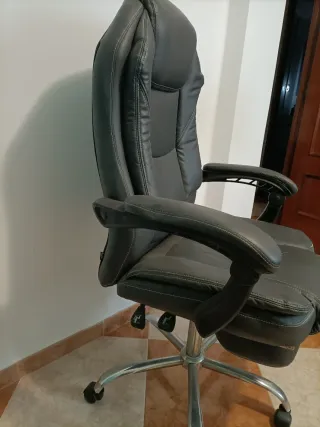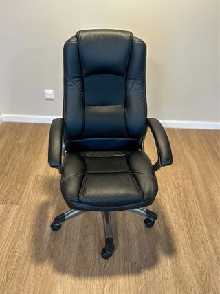 Silla de oficina con acabado en piel sintética. - Diseño ergonómico. - Base con ruedas para fácil movilidad. - Respaldo alto para mayor comodidad. *Tiene algun rasguño (se ve en las fotos) en el reposabrazos izquierdo) y la inclinación hacia atras está algo desajustada del lado izquierdo.