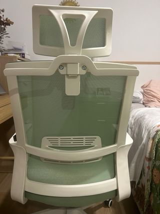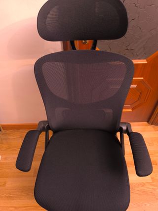 Silla de oficina con diseño ergonómico y reposacabezas: - Respaldo de malla transpirable. - Asiento acolchado. - Reposabrazos y reposacabezas ajustables. - Base giratoria con ruedas. La silla es muy cómoda y está en perfecto estado, completamente nueva. Sólo tiene 10 días de uso. La vendo porque soy muy alto (1,90) y no me acaba de venir bien, me queda un poquito pequeña, pero para una persona de menor estatura a la mía es perfecta. Facilito las medidas a quien las requiera.