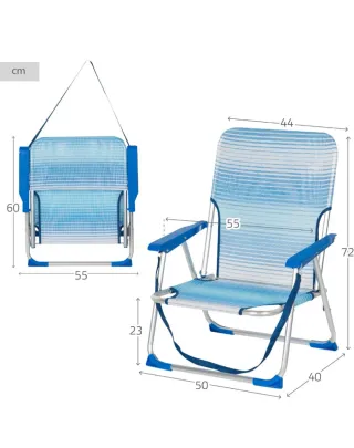 Silla plegable perfecta para la playa o el camping. Su diseño a rayas azules y blancas la hace destacar. - Estructura de metal. - Asiento y respaldo de tela. - Reposabrazos de plástico.