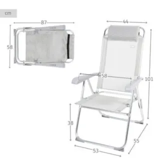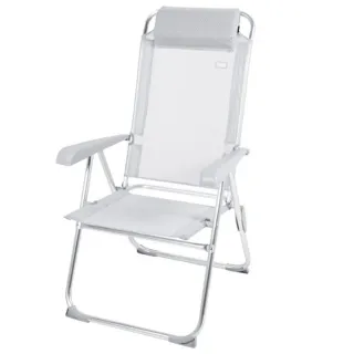 Silla camping plegable color gris Aktive Camping con cojín acolchado y topes antivuelco para mayor seguridad Medidas: plegada 87x58 cm; desplegada 44x55x101 cm; altura asiento 38 cm; ancho patas 53 cm; distancia reposabrazos 58 cm; peso silla 4 kg; peso soportado 110 kg Materiales: tejido de textileno (resistente, transpirable y fácil de limpiar), estructura de aluminio (antioxidante y duradera) y reposabrazos de plástico Gran comodidad: incorpora reposabrazos, no tiene barra frontal en las piernas, tiene cojín acolchado y el respaldo es multiposición (se puede colocar en 5 posiciones diferentes)