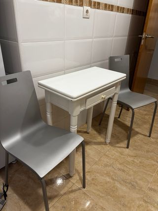 Mesa extensible blanca con cajón + 2 sillas grises en buen estado. Ideal para cocinas pequeñas o pisos. La mesa se puede ampliar fácilmente para tener más espacio cuando lo necesites. Conjunto práctico y compacto. Precio: 65€
