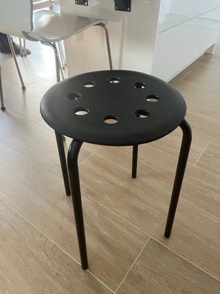 Conjunto de dos taburetes de cocina de Ikea. Su diseño moderno y funcional los hace perfectos para cualquier espacio. - Estructura de metal. - Asiento redondo con agujero central.