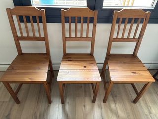 Conjunto de tres sillas de madera, perfectas para tu comedor o cocina. - Diseño rústico y elegante. - Asiento y respaldo de madera maciza. - Patas estables para mayor seguridad.