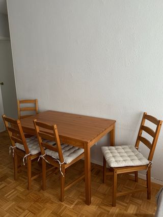 Conjunto de mesa y cuatro sillas de madera modelo JOKKMOKK de IKEA. Ideal para comedor o cocina. La madera esta perfecta. Tiene una pequeña gota de pegamento transparente como se ve en la foto. Las sillas tienen algunas muescas, que podrían arreglarse. - Mesa de madera maciza. - Cuatro sillas de madera a juego. - Cojines incluidos para las sillas. Medidas: 118x74x74cm Sillas: 90x40x40cm