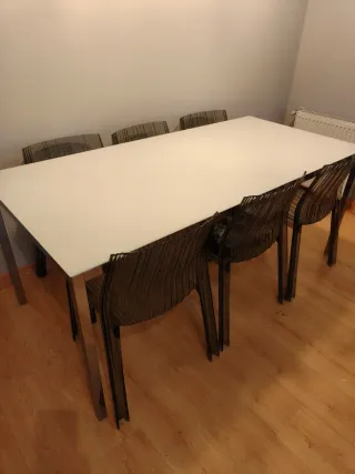 Conjunto de mesa Torsby con seis sillas de diseño moderno. Ideal para tu comedor o cocina. - Mesa con estructura metálica y superficie blanca de cristal. - Sillas con asiento y respaldo de plástico transparente ahumado. Algunas sillas han perdido el taco que las une al suelo y tienen puesto protector.