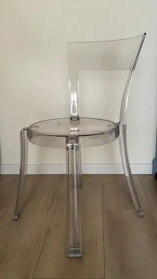 Conjunto de cuatro sillas de diseño moderno y elegante, perfectas para tu cocina o comedor. Su acabado transparente aporta luminosidad y amplitud a cualquier espacio. - Estructura de plástico resistente. - Diseño contemporáneo. - Apilables para un fácil almacenamiento.