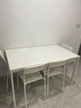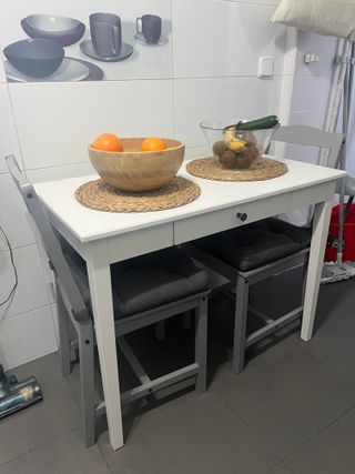 Vendo conjunto de mesa extensible blanca con 4 sillas grises modelo VANGSTA / KÄTTIL de IKEA. La mesa es extensible (de 120 a 180 cm), ideal tanto para el día a día como para cuando tienes visitas. ✔️ Mesa blanca extensible ✔️ 4 sillas con estructura blanca y asiento gris claro ✔️ Conjunto estable y cómodo ✔️ Muy cuidado y en buen estado general 🔎 Detalle a tener en cuenta: la mesa tiene un pequeño desperfecto en la superficie blanca, visible en la foto (estético, no afecta al uso). Perfecto para comedor o cocina. Se vende el conjunto completo. 📍 Recogida en mano. 💬 Cualquier duda, escríbeme sin problema.