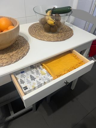 Mesa de ala abatible IDANÄS de IKEA y dos sillas HAUGA de madera color gris, comprado todo en febrero de 2025. En perfecto estado. Las sillas tienen la medida ideal para poder meterse debajo de la mesa, bien por los lados o por los extremos. Las medidas de la mesa son 51 cm acho x 96 cm largo x 75 cm alto. Extendida el ala pasa a ser 87cm de ancho. El precio original dela mesa fue 149 euros y las sillas 25 euros cada una. Vendo la mesa por 100 y cada silla por 15 euros (130) o bien todo junto por 120 euros.