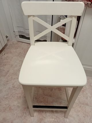 Dos taburetes de cocina en madera blanca Ikea. Tienen algún golpe pequeñito en los respaldos. Altura del asiento 63 CMS. El precio es por cada uno.