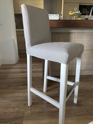 Se venden dos taburetes altos de cocina ya montados. Son de tela gris y patas de madera blancas. Están como nuevos y son ideales para una cocina moderna. montados y listos para usar. - Diseño sencillo y elegante. - Perfectos para desayunar o comer en la barra de la cocina. - Fáciles de limpiar.