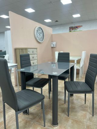 Conjunto moderno con mesa de cristal templado de alta resistencia y estructura metálica. Diseño elegante y funcional, ideal para comedor o cocina. *Producto nuevo de fábrica. Medida de la mesa: 160 x 90 cm -Envío a domicilio (consultar tarifa) -Pago contra reembolso -Garantía de 3 años Ref: ARANA + HS-05