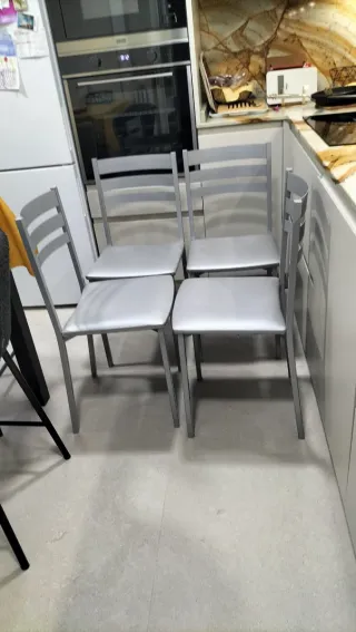 Conjunto de cuatro sillas de comedor con un diseño moderno y elegante. - Asientos y respaldos tapizados. - Estructura metálica resistente. - Precio original de 100€ la unidad. - En muy buen estado. Medidas: Desde suelo: 85 cms Asiento 38*38 cms Altura respaldo 47 cms