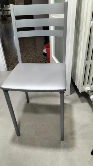 Silla de cocina con un diseño moderno y elegante. - Estructura metálica plateada. - Asiento tapizado en polipiel negra. - Respaldo con detalle rectangular. Medidas: 41x 47 x 86 cm (ancho x fondo x alto) Precio de las 4 sillas 80 euros.