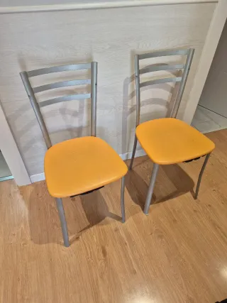 Conjunto de dos sillas para cocina, comedor, terreno, piso de alquiler, peña o lo que se tercie. Llevan marcas de uso de ahi el precio, revisar bien fotos pero estan bastante bien y hacen el papel perfectamente. Se compraron en Conforama a 39,90 cada una.