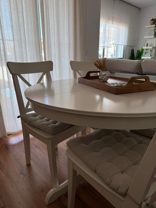 Conjunto de mesa y cuatro sillas de comedor en color blanco de IKEA. Ideal para espacios acogedores. - Mesa cuadrada extensible. 90x90/ 120x90m extendida parcialmente / 160x 90m extendida totalmente - Sillas con respaldo cruzado. - Cojines incluidos (se pueden lavar en la lavadora) - desperfectos visibles en las fotos.