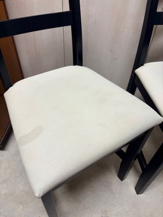 Conjunto de 6 sillas (45 euros todo el conjunto) de comedor con un diseño moderno y elegante. El contraste entre la estructura oscura y el asiento claro aporta un toque sofisticado a cualquier espacio. - Estructura de madera oscura. - Asiento tapizado en tela beige. 4 en muy buen estado. 2 con la tapicería un poco manchada pero lavable.