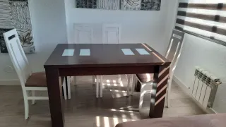 Se vende precioso conjunto de comedor en excelente estado, ideal para darle un toque moderno y sofisticado a tu hogar. Incluye: - 1 mesa robusta de madera en tono oscuro - 6 sillas blancas a juego, cómodas y resistentes. Características: - Materiales de alta calidad (no es IKEA) - Diseño elegante que combina con cualquier decoración. - Muy bien cuidado, listo para usar - Perfecto para reuniones familiares o cenas especiales Medidas: 1. Mesa: 130cm de largo, extensible a 180cm. Altura, 80cm Ancho: 84cm 2. Sillas: alto, 104cm y ancho asiento 46cm. ¡No dejes pasar esta oportunidad! NO SE ENVIARÁ. Recogida en domicilio.