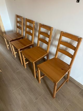 Conjunto de cuatro sillas de comedor de madera, con un acabado en color roble que aporta calidez a cualquier espacio. - Diseño clásico y funcional. - Patas robustas - Respaldo con listones horizontales. A mitad de precio de lo que costaron y te ahorras montarlas Algunas marcas de uso detalladas en las fotos Precio no negociable No envio