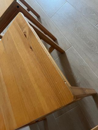 Silla de comedor de madera de pino, estilo rústico. - 10€ cada silla (descuento si te quedas las 7) - Diseño clásico de cuatro travesaños. - Patas robustas y asiento cómodo. - Acabado natural de la madera. - Alguna tiene alguna para un poco mordida por un conejo.