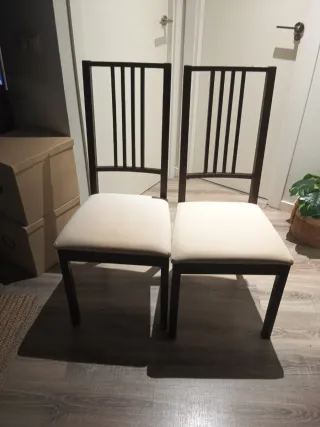 Se venden dos sillas de comedor en muy buen estado, prácticamente nuevas. Son cómodas y elegantes, perfectas para cualquier hogar. - Tapicería de tela. - Patas de madera. 20€ cada una.