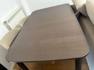 Mesa de comedor de madera de IKEA, con diseño extensible para adaptarse a tus necesidades. - Material: Madera. - Extensible. Its a wooden dining table which is extensible. In great condition. Comes with 6 chairs I also have cushions for chairs. Length before extension: 140cm Length after extension: 220cm Width: 85cm Height: 75cm Self pick up only from Girona.