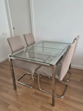 Mesa de comedor GLIVARP de Ikea, en perfecto estado. Extensible. - Tablero de cristal templado - Estructura de metal. - Patas cromadas. Medidas 125 (cerrada) / 188 (abierta) x 85 cm. *Regalo las 4 sillas con fundas de la foto (eran de polipiel pero se ha deteriorado y sólo se pueden usar con la funda, tengo de recambio).