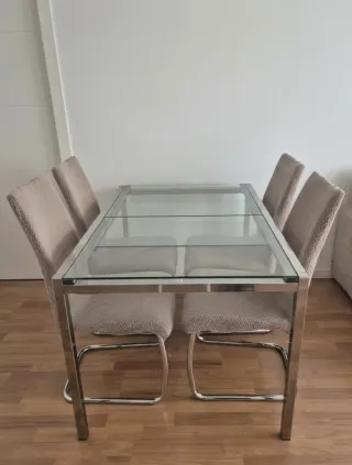 Mesa de comedor con un diseño moderno y elegante. - Tablero de cristal. - Estructura de aluminio. - Medidas: 135 x 85 cm. - Hay que limpiar las patas, tiene alguna mancha. Opcional, 6 sillas Ikea 100 euros.