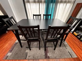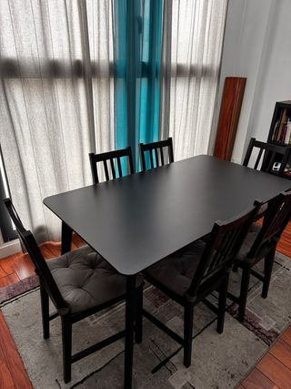 ✔ Mesa negra moderna (muy resistente y fácil de limpiar) ✔ 6 sillas de madera negras ✔ Ideal para comedor o cocina amplia 💯 Sin golpes ni desperfectos importantes 🏠 Siempre en interior, ambiente limpio y sin mascotas Se vende por mudanza