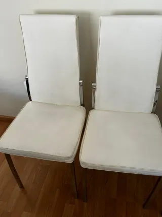 Conjunto de cuatro sillas para cocina o comedor. Su diseño moderno se adapta a diferentes estilos. - Estructura de metal. - Asiento tapizados en piel blanca. -Comodas -Regalo de colchonetas #silla #cocina #hogar #comodas #venta