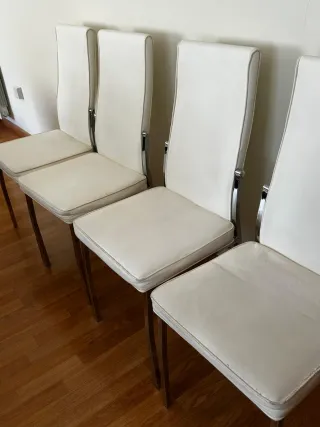Modernas sillas de comedor con un diseño elegante. - Set de 4 sillas. - Tapicería blanca. - Patas metálicas acero inoxidable.