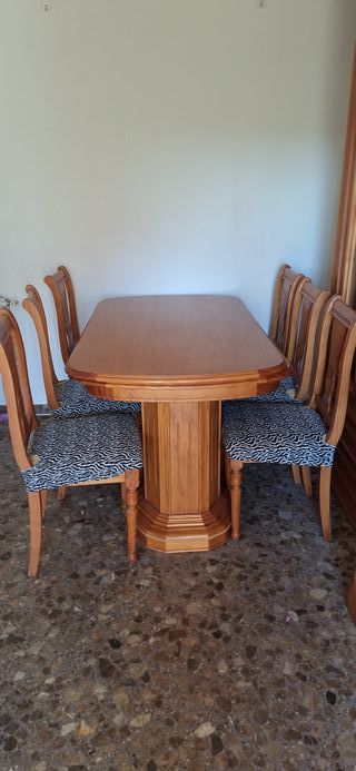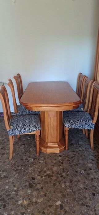 Conjunto de mesa de comedor extensible con seis sillas a juego. Se encuentra en buen estado. - Mesa de madera con extensión. - Seis sillas a juego.