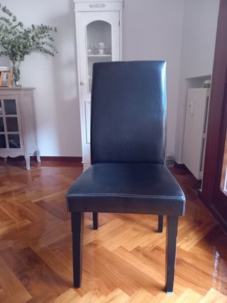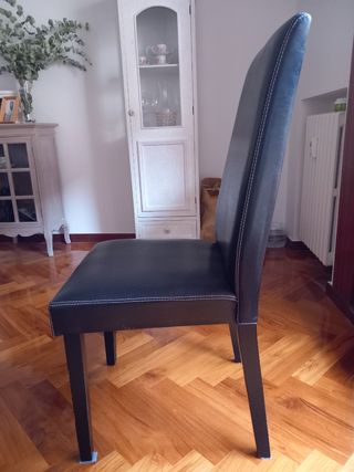 Conjunto de ocho sillas para comedor. 6 negras ecopiel deteriorada y 2 marrón enkperfecto estado. Se venden con funda negra nueva. Se ven perfectas. Su diseño moderno se adapta a cualquier estilo. - Tapicería de piel sintética. - Estructura resistente.