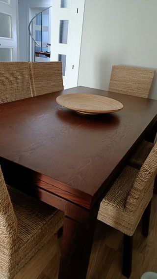 Conjunto de mesa de comedor extensible con cuatro sillas. - Mesa con superficie de madera oscura. - Sillas con asientos y respaldos de yute tejido.