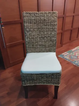 Conjunto de seis sillas de comedor de estilo colonial. Su diseño tejido aporta un toque rústico y elegante a cualquier espacio. - Estructura principal de fibra de coco. - Patas de madera oscura. - Almohadones color hueso