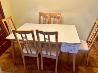 Conjunto de mesa ikea y cuatro sillas. Vendo por mudanza, está impecable, ni una sola marca. Se puede usar como mesa de comedor o bien como escritorio para una habitación. Medidas de la mesa 110x67cm Las 4 sillas blancas de estilo nórdico están perfectas también. Regalo en mantelito si lo quieres.