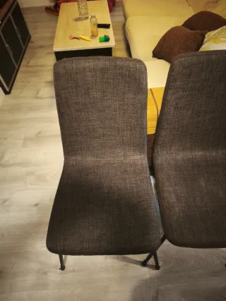 Conjunto de cuatro sillas de comedor con un diseño moderno y elegante. - Tapicería de tela. - Patas metálicas resistentes. - Les pusimos unos tacos con cinta aislante para proteger la tarima, se pueden quitar.