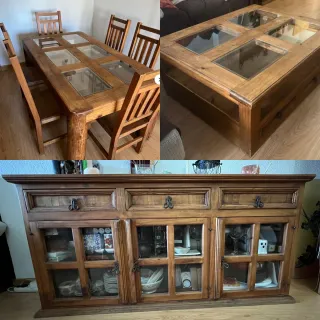 Espectacular comedor de estilo Renacimiento Español en madera maciza tallada a mano. Un conjunto de alta ebanistería que destaca por su elegancia y robustez. Incluye: Gran Aparador: Frontales con impresionantes tallas de bustos clásicos, herrajes de bronce originales y espejo superior moldurado. Vitrina de Gala: Con baldas de cristal y tallas ornamentales en la base. Mesa de Comedor: Gran superficie con patas talladas de diseño señorial. Sillas: Tapizado clásico y respaldos trabajados. Piezas únicas en excelente estado de conservación, ideales para ambientes distinguidos o coleccionista de antigüedades.Puedes hacer oferta seria