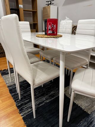 Conjunto de mesa de comedor y sillas con diseño moderno y elegante. - Mesa de comedor blanca con inserto en cristal negro. - Sillas de comedor con tapicería negra y estructura blanca. Medidas: 135 (205) x 90 x 76 cm Alguna silla tiene pequeñas marcas en las patas.
