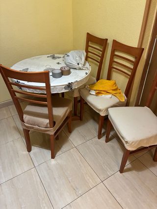 Conjunto de mesa de comedor con cuatro sillas a juego. - Mesa de comedor rectangular. - Cuatro sillas de madera con respaldo. ( no desmonto ni bajo a la calle se sube a por ello ) y se desmonta