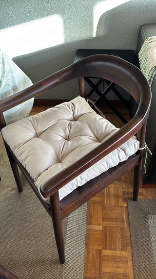 Conjunto de sillas de comedor con un diseño moderno y elegante. - Estructura de madera oscura. - Cojín de asiento en tela beige. - Diseño curvo en el respaldo. Se venden unicamente en persona, se venden porque ocupan mas de lo que pensabamos. Es madera de acacia. Costaron hace menos de un año 1200€ las 6 sillas. El precio es por las 6, no se venden por separado.