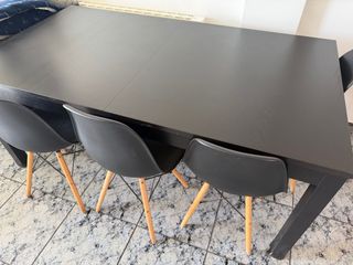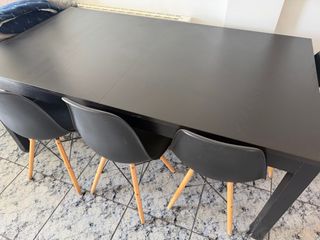 Conjunto de comedor compuesto por mesa extensible en color wengué/negro y 4 sillas tapizadas en color blanco. La mesa es muy robusta y estable, con sistema extensible central oculto. Las sillas son cómodas, firmes y están en buen estado. Ideal para salón o comedor. 📐 Medidas mesa: • Largo: 147 cm (extensible) • Ancho: 95 cm • Alto: 75 cm ✨ Características: • Sistema extensible central • Estructura sólida • Color wengué / negro • 4 sillas tapizadas incluidas • Capacidad ampliable para 6–8 personas